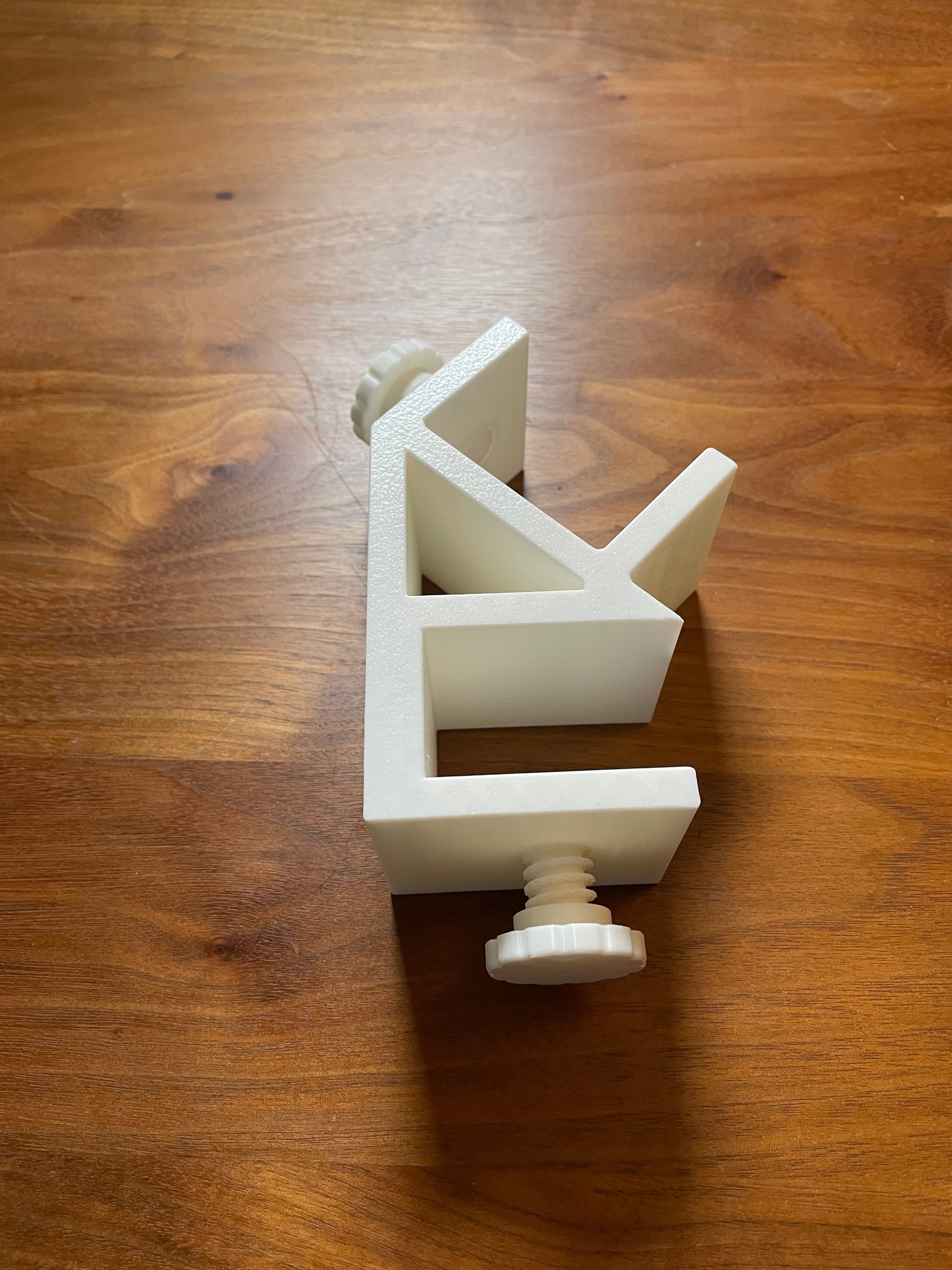 Den er lavet i PLA. og vejer 75g afhængig af størrelse naturligvis. 2 Skruer medfølger.